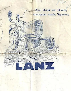 Όπως φαίνεται, το μάρκετινγκ και η στοχευμένη διαφήμιση έχουν ρίζες στον τόπο μας και δεν είναι πρόσφατα δημιουργήματα. Έτσι η συγκεκριμένη αντιπροσωπεία... "γεωργικών ελκυστήρων" διαφημίζει έμμετρα, την 10ετία του'50, το τραχτέρι που δουλεύει σαν ξεφτέρι. Ένα από αυτά τα ξεφτέρια, αγοράστηκε τότε και δούλεψε για χρόνια στην Αμφίκλεια. Στην φωτογραφία του 1958, τα παιδιά της οικογένειας του ιδιοκτήτη ποζάρουν με καμάρι, παρέα με το "ξεφτέρι LANZ". [Αρχείο Λ. Γ. Ρεστέμη]