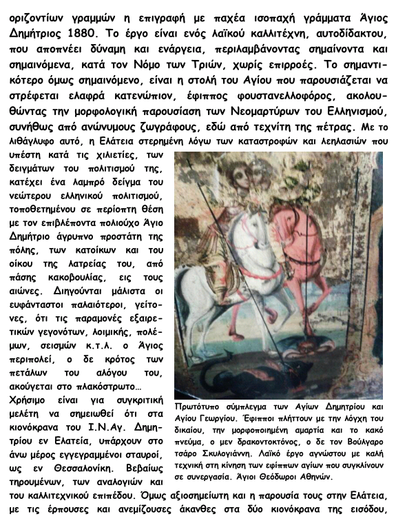 Tον Ι. Ν. Αγίου Δημητρίου Εν Ελατεία , κοσμεί ένα λαϊκό λιθανάγλυφο εντοιχισμένο επί της παρειάς του δυτικού τοίχου δεξιά τω εισερχομένω. Το έργον αυτό αποτελεί το σημείο αναφοράς της σημερινής Ελατείας και είναι προσφορά της «παρέας», της συντροφίας των Ηπειρωτών οικοδόμων της «πέτρας»,.....