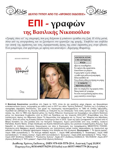 Σας προσκαλώ τη Δευτέρα 27 Μαρτίου 2023 και ώρα 19.30 στην παρουσίαση της ένατης, ποιητικής μου συλλογής με τίτλο "ΕΠΙ-γραφών" που θα πραγματοποιηθεί στην αίθουσα "Γ. Πλατή" μέσα στο νεοκλασικό κτήριο στο Δημοτικό Ωδείο Λαμίας....